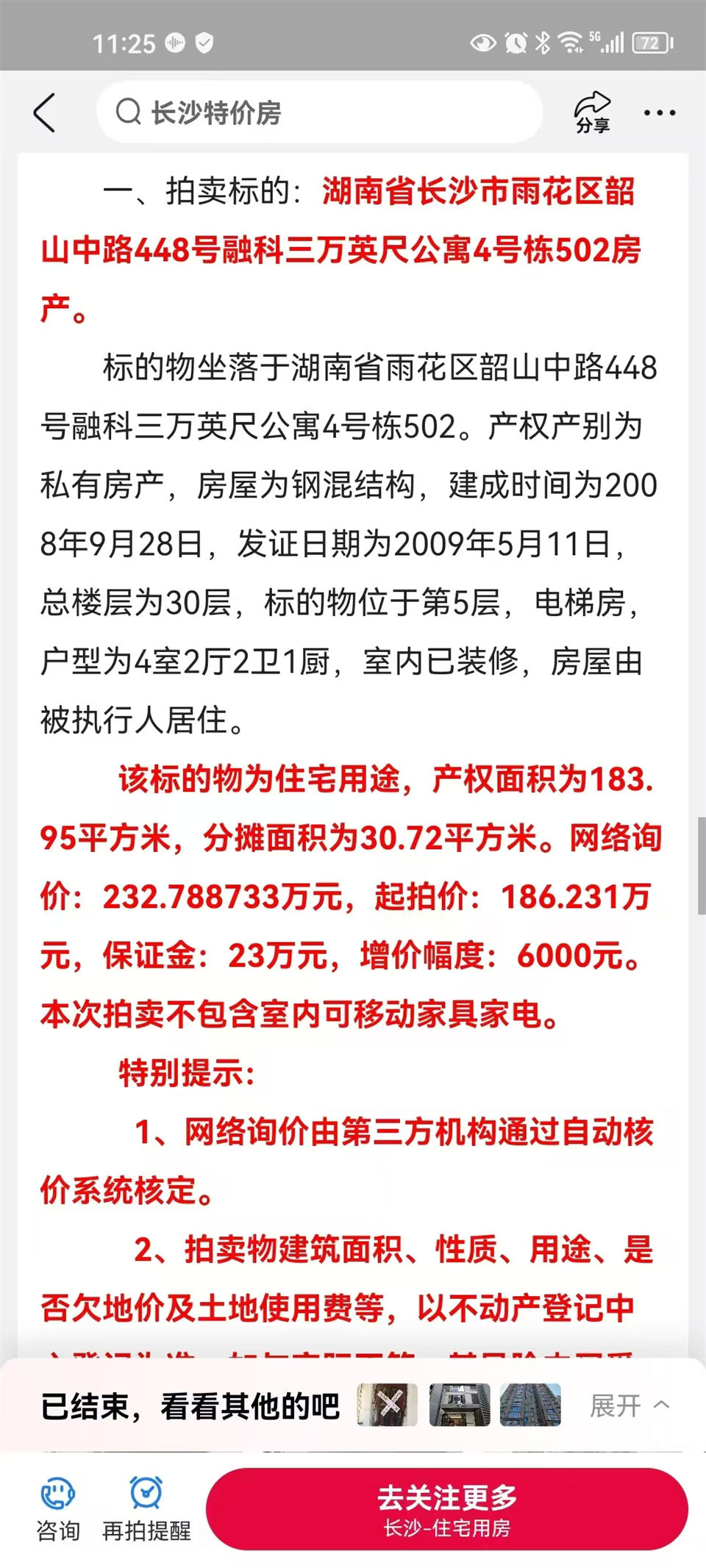 圖8、陳阿姨是我司湖南法拍網法拍房地產經紀有限公司第197位VIP客戶,1月份簽約的(想買個湘雅附二醫(yī)院附近的房子),服務了整整10個月。推薦了多少房子,幫看過帶看過多少都記不清了,光有據可查調查報告都出了9套,回回緣分都沒到(其實陳阿姨很給力,有幾次參與二拍的房子,都超過一拍價了還在加,但就是沒緣分沒拍到)。就連融科三萬英尺這套中間一度因事不想參拍了,淑君勸了下,然后決定拍,結果緣分終于到了,二拍底價拿下了,直接撿漏50萬以上,太香了。
